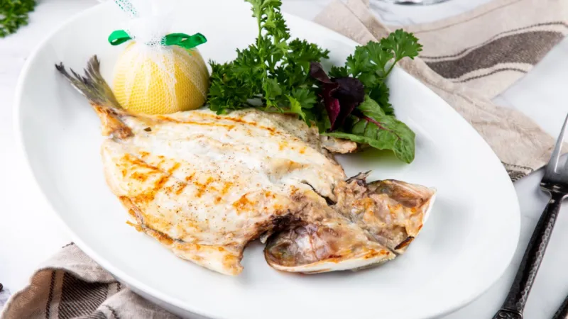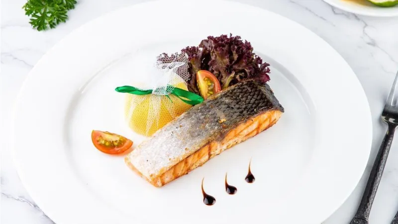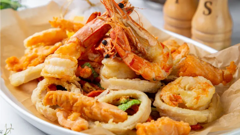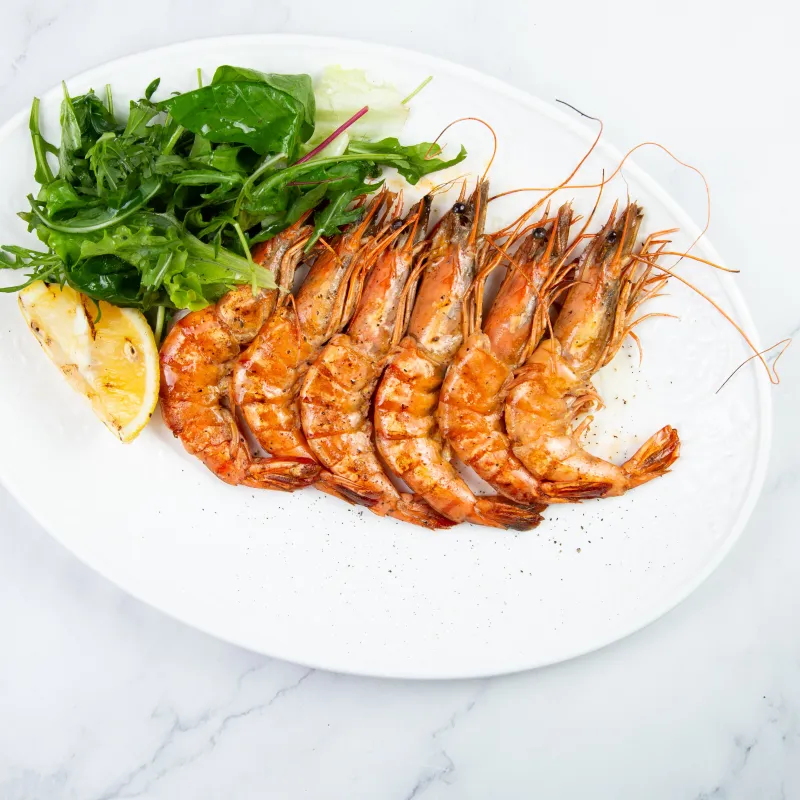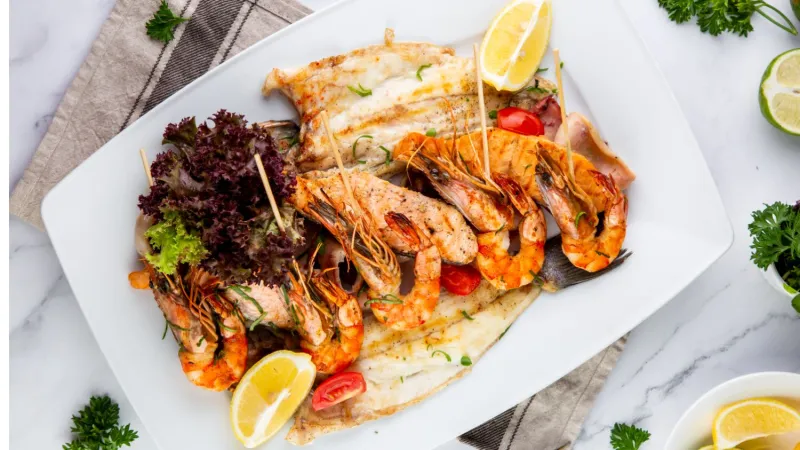 окунь, королевские креветки, семга, кальмары