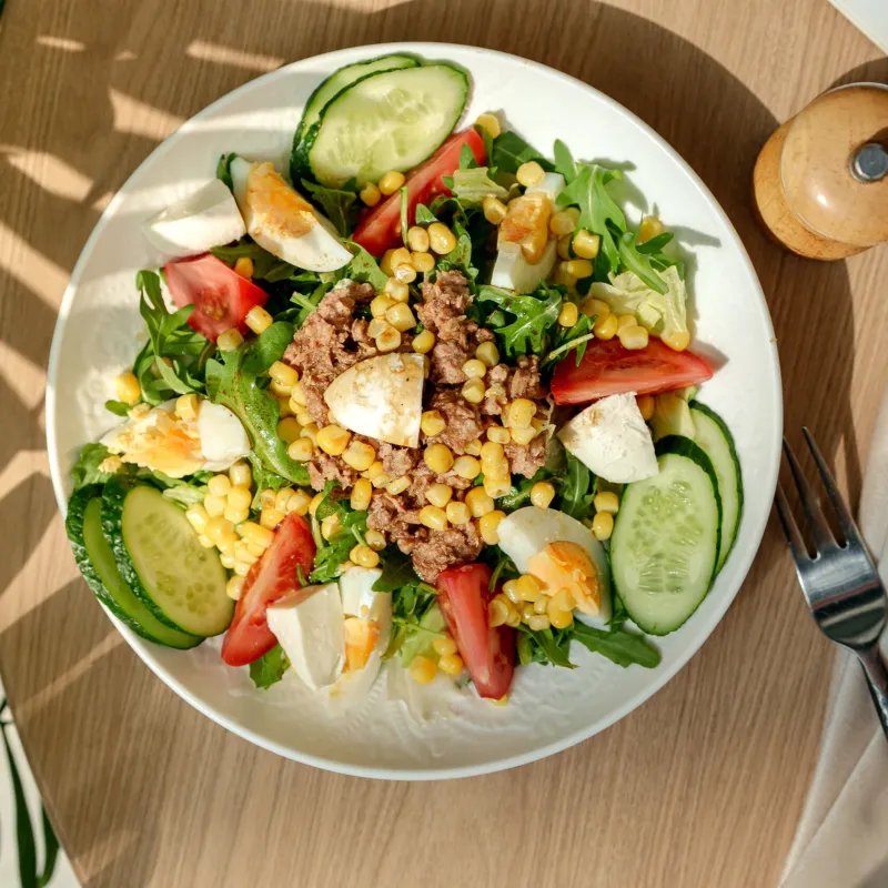 Руккола, кукуруза, подкопченый тунец, моцарелла, яйца
