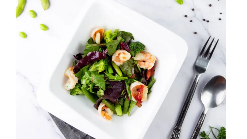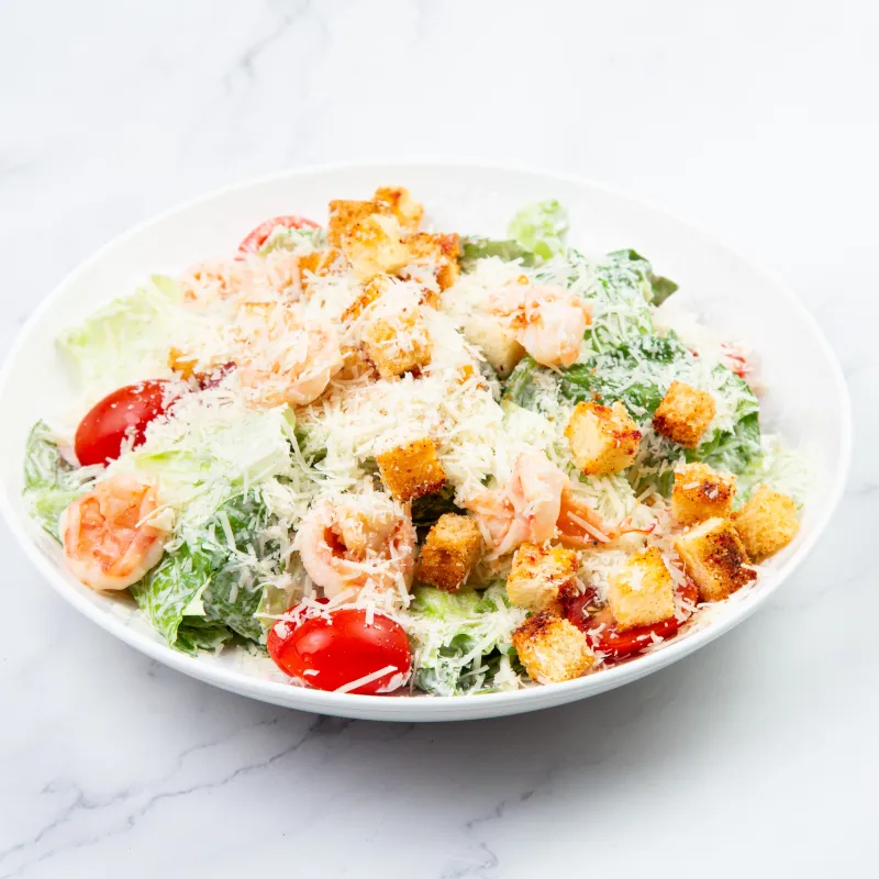 Салат ромэн, черри, пармезан, сухари, соус цезарь, майонез и креветки