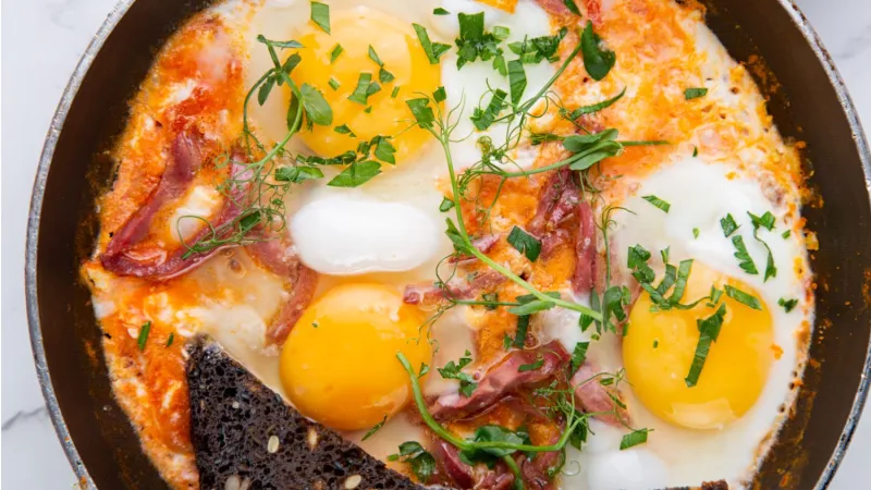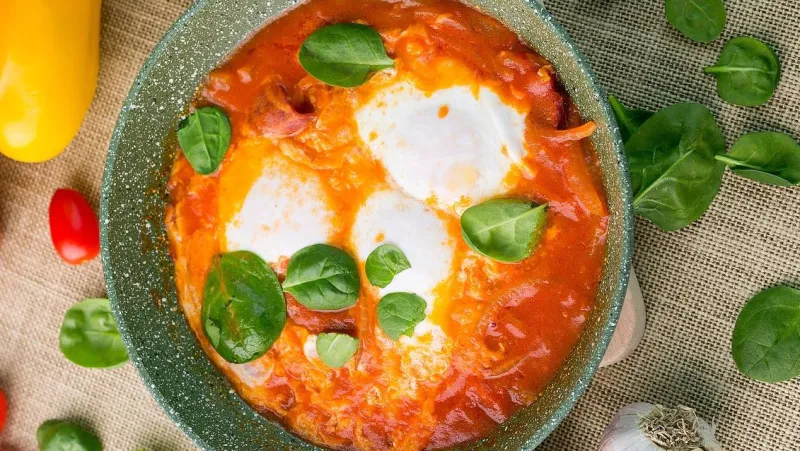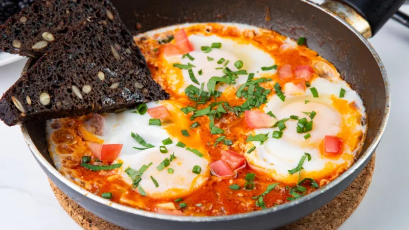Яйца, перец, зира, чеснок, лук, помидоры, зерновой хлеб