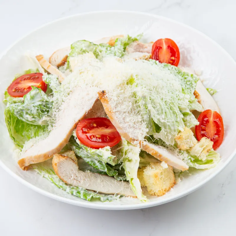 Салат ромэн , черри, пармезан, сухари, соус цезарь, майонез и курица