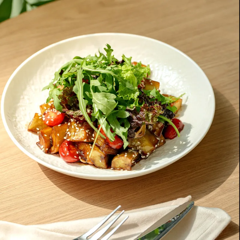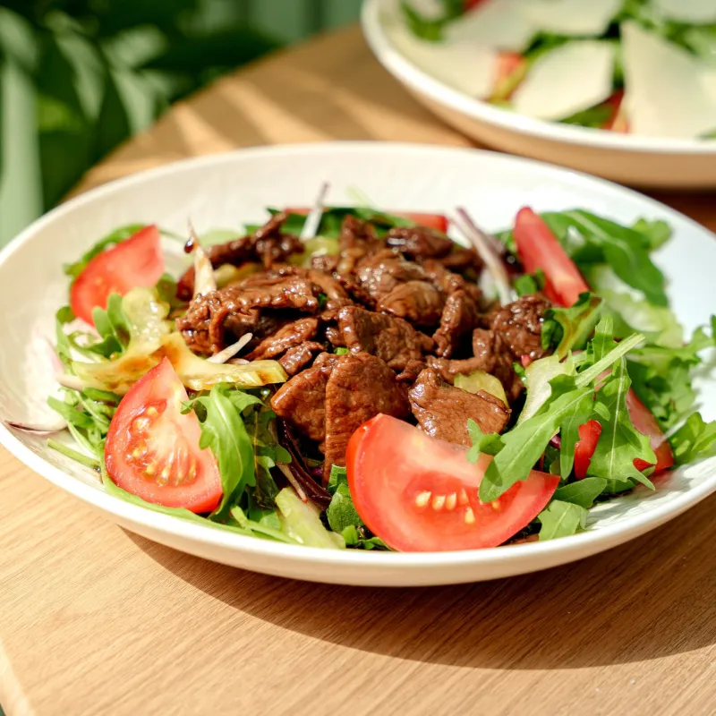 Помидоры, конина, говядина, сельдерей, красный лук, руккола, соус унаги (кисло-сладкий соус)