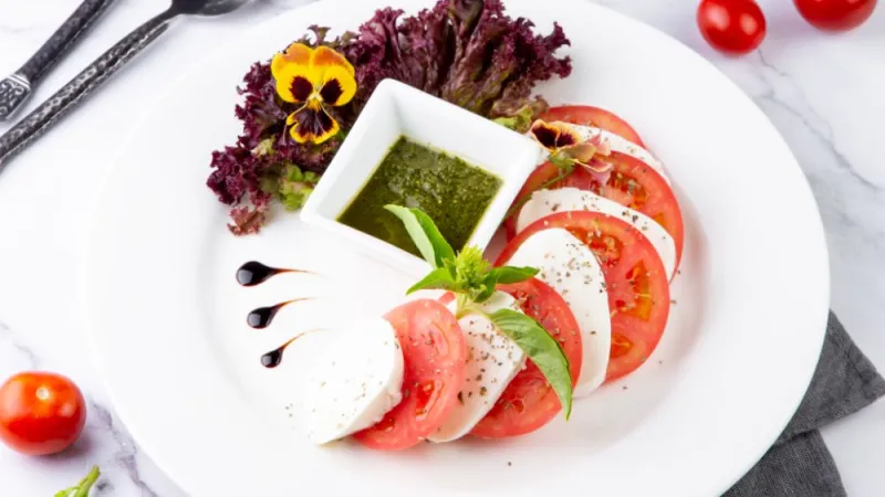 Помидоры,моларелла galbani, соус песто(оливковое масло, бальзамик, кедровые орехи), оригано