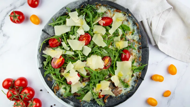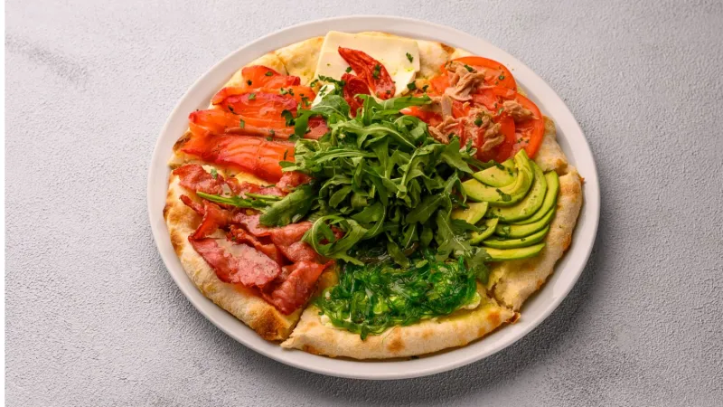 проволоне, руккола, черри, микс конины и говядины, пармезан,чеснок
