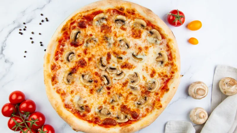 Пицца соус, проволоне , шампиньоны , оливковое масло