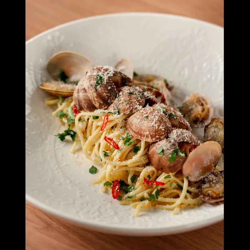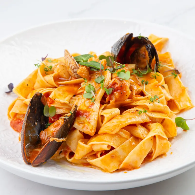 Фреш паста собственного приготовления с добавлением чернила каракатицы и вонголе в соусе биск