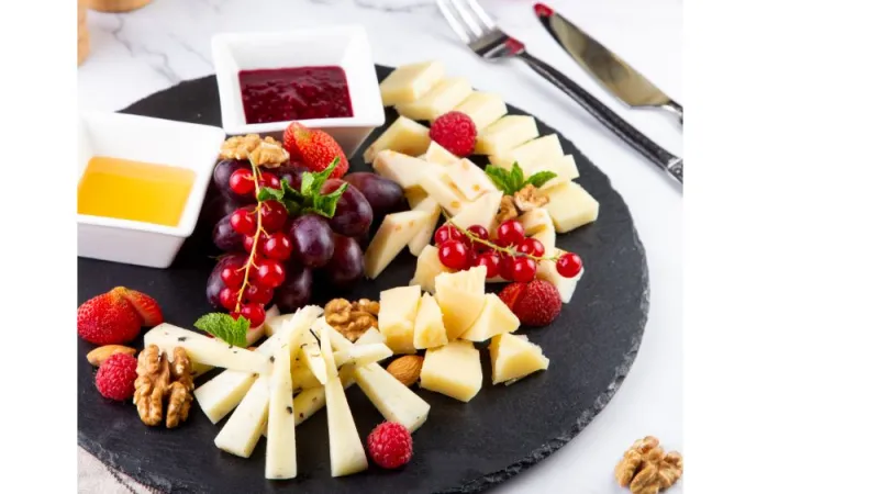 Пармезан, трюфель, качотта, сыр швейцарский, мед, варенье, клубника, курага, орех грецкий.