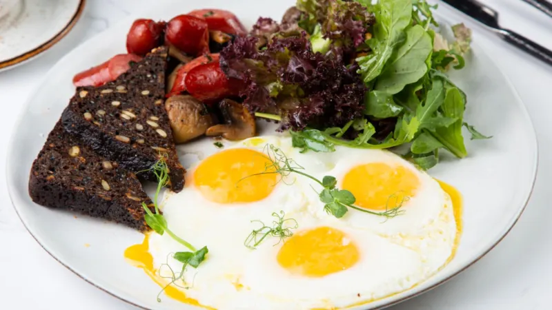 Яйца, бекон говяжий, тост из бородинского хлеба