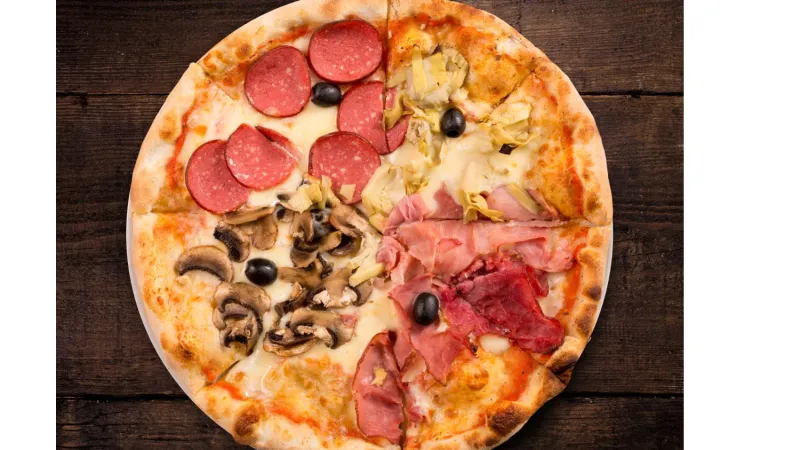 Пицца соус, проволоне, бекон, салями, шампиньоны, маслины