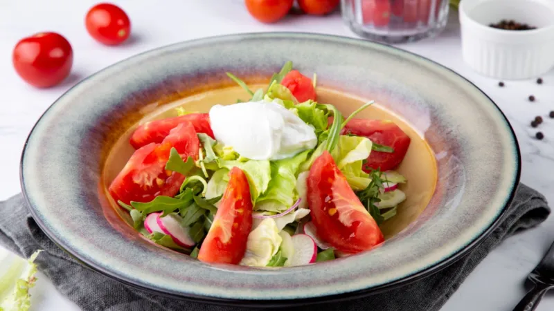Козий сыр, редис, салат айсберг, руккола, красный лук, помидор, огурцы, сельдерей, валериана (зелень)