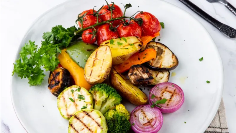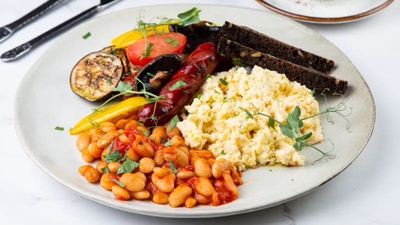 Яйца, шампиньоны, фасоль, овощи гриль, салат, хлеб черный с семечками