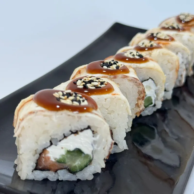 сыр сливочный, огурец, филе лосося, соус ред, соус унаги, кунжут белый жаренный