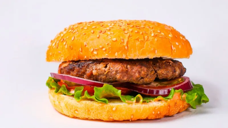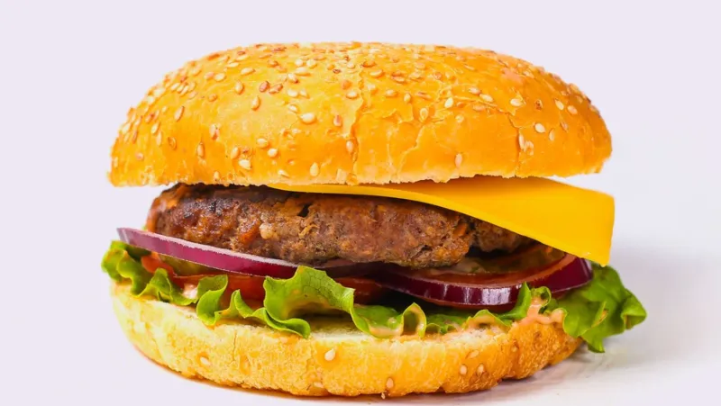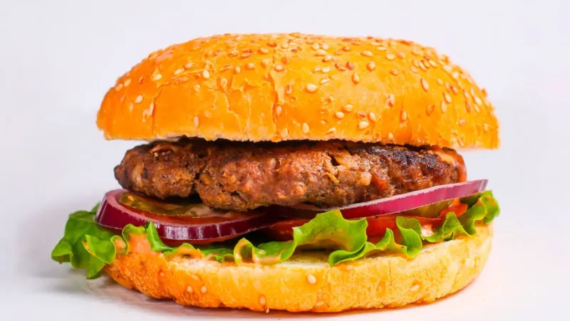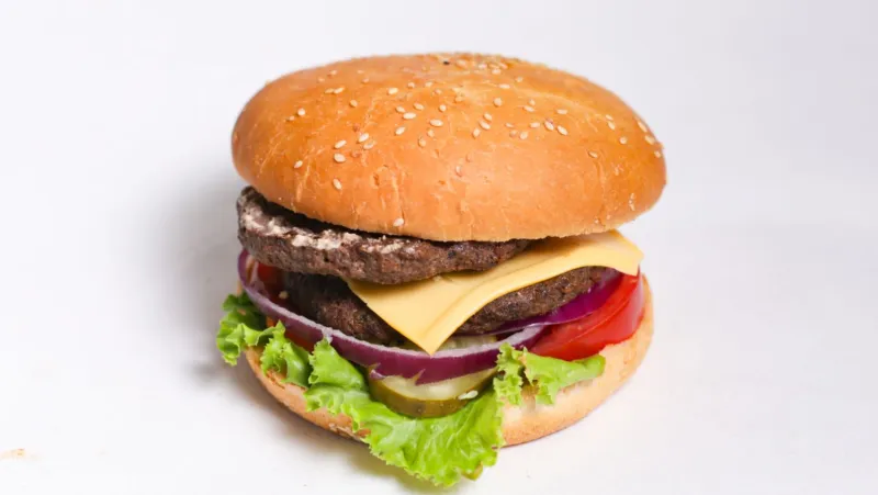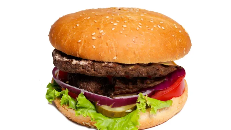 2 шт. говяжья котлета, сыр чеддер, помидор, красный лук, солёные огурцы, соус бургер, лист салата