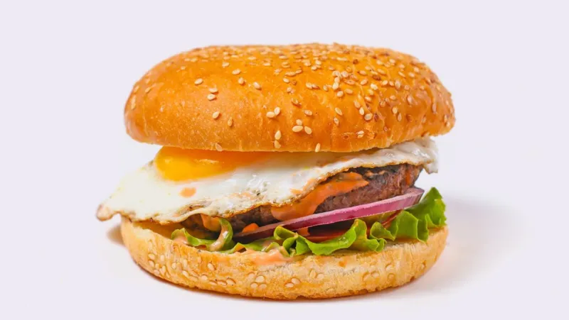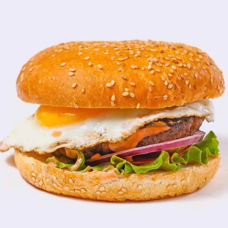 говяжья котлета, яйцо, помидор, красный лук, солёные огурцы, соус бургер, лист салата