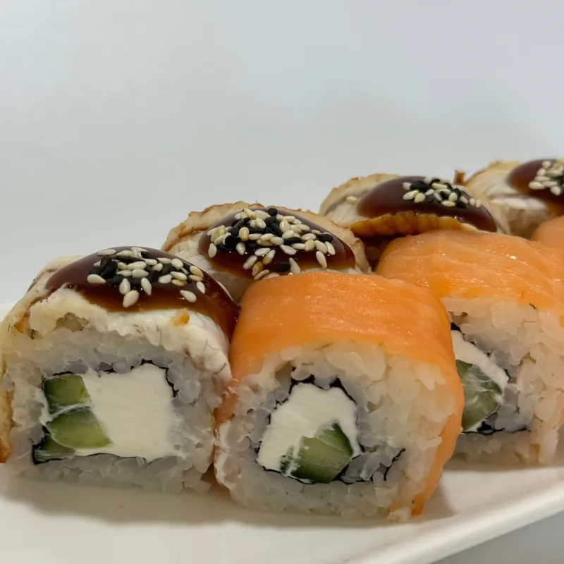 лосось, творожный сыр, огурцы, сверху угорь