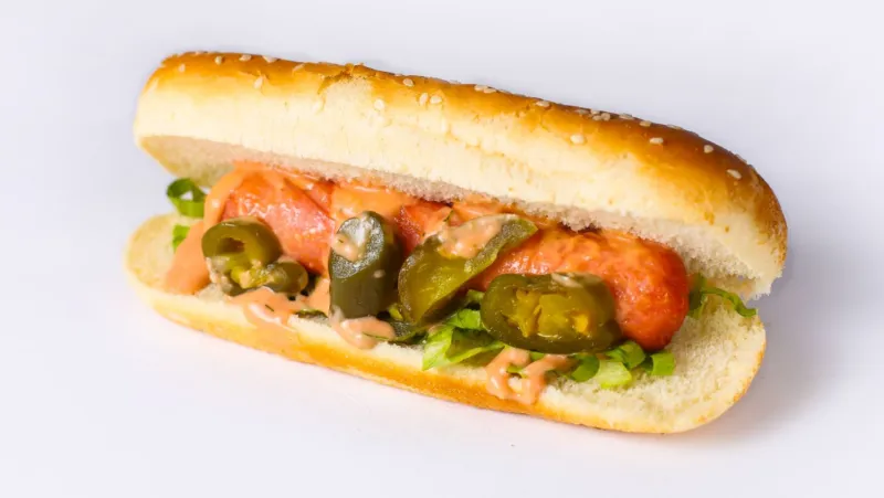 помидор, солёные огурцы, соус кетчуп, майонез, айсберг, сосиска говяжья, халапенью