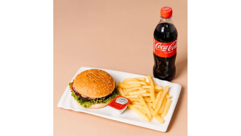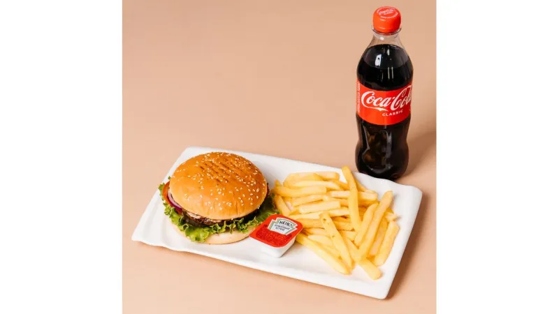 говяжья котлета, помидор, красный лук, солёные огурцы, соус бургер, лист салата, острый соус + кола 0,5+ фри +соус кетчуп