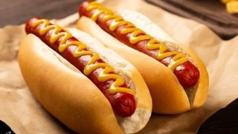 помидор, солёные огурцы, соус кетчуп, майонез, айсберг, сосиска говяжья, сырный соус
