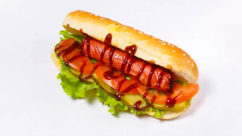 помидор, солёные огурцы, соус кетчуп, майонез, айсберг, сосиска говяжья, соус BBQ