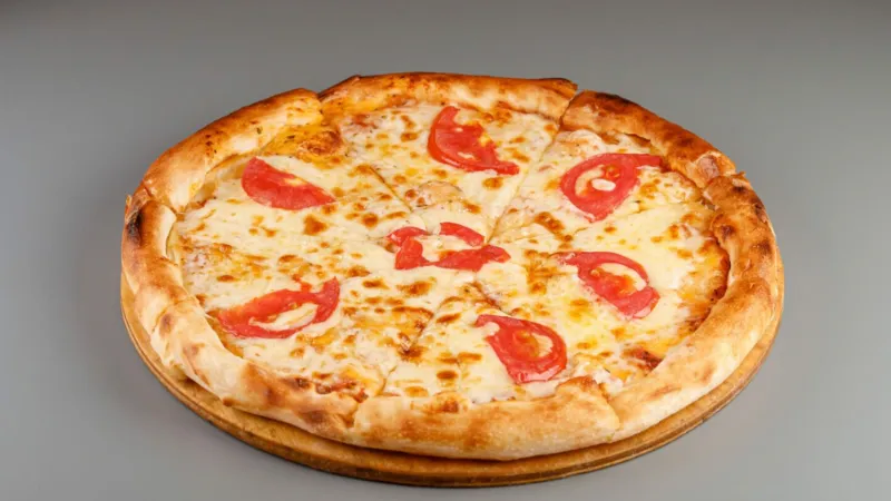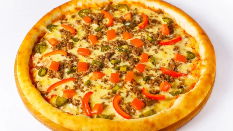 сыр моцарелла, соус томат, помидор, фарш, кукуруза, перец цветной