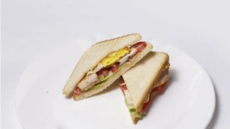 классический бутерброд из тостерного хлеба, куриной грудки-гриль, свежих помидоров и огурцов, майонез, яйцо