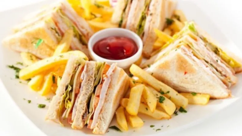 классический бутерброд из тостерного хлеба, куриной грудки-гриль, свежих помидоров и огурцов, майонез,