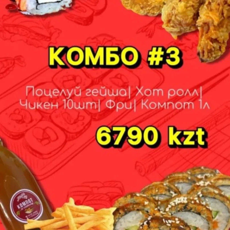 поцелуй гейша | хот ролл | чикен 10 шт | фри | компот 1л