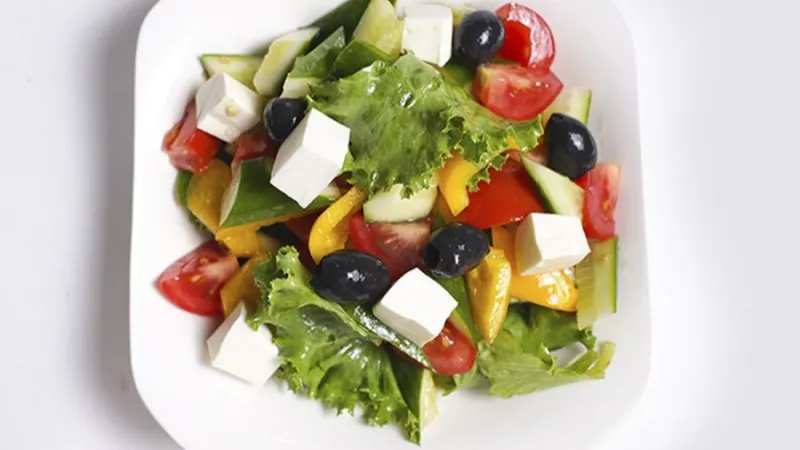 лист салата, огурцы, помидор, маслины, фетакса, болгарский перец, оливковое масло