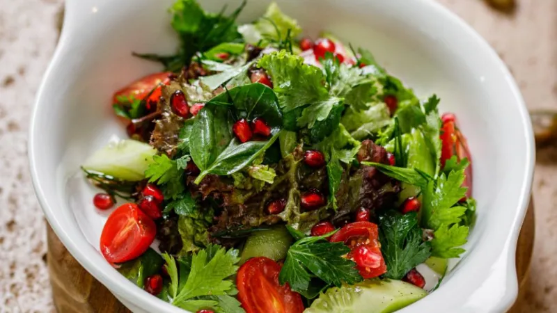 лист салата, черри, огурцы, зерна граната, хлеб, авторский соус