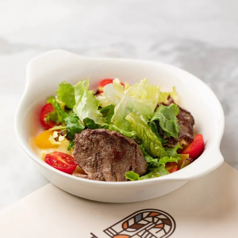 говяжья вырезка, сладкий перец, вяленый черри, руккола, авторский соус, гранат