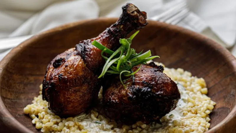 куриная голень, булгур, фирменный соус