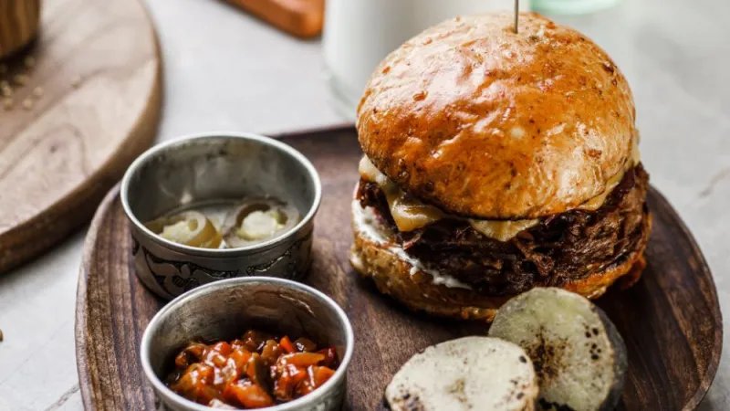 закрытая булочка, котлета из конины, авторский соус