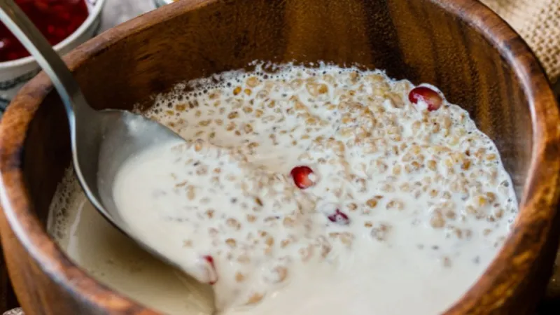 ячменная крупа, молоко, тотыра май, малиновый джем