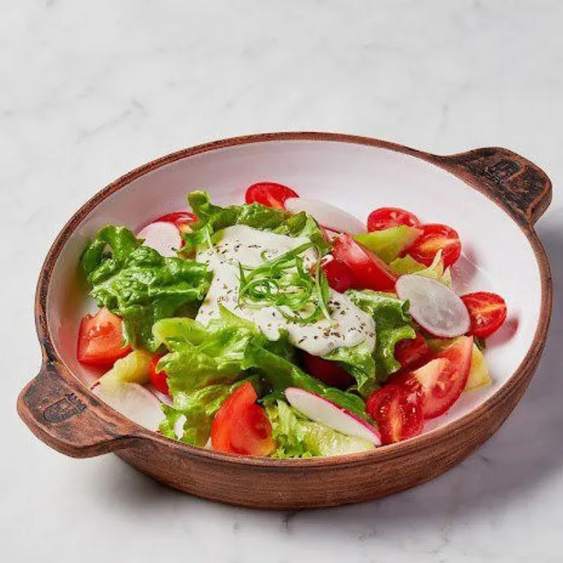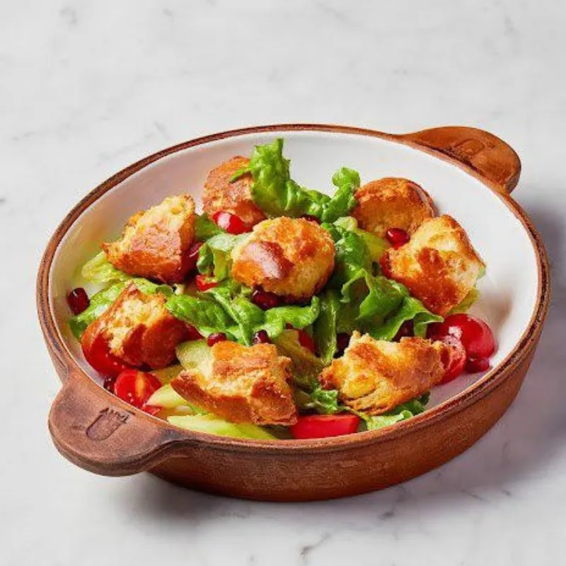 Лист салата, черри, огурцы, зерна граната, хлеб, авторский соус
