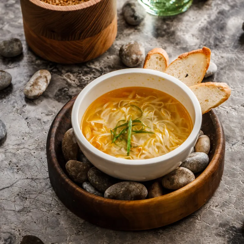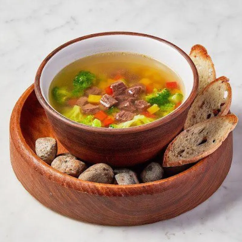 Бульон конины, нут, овощи, хлеб, хлебцы