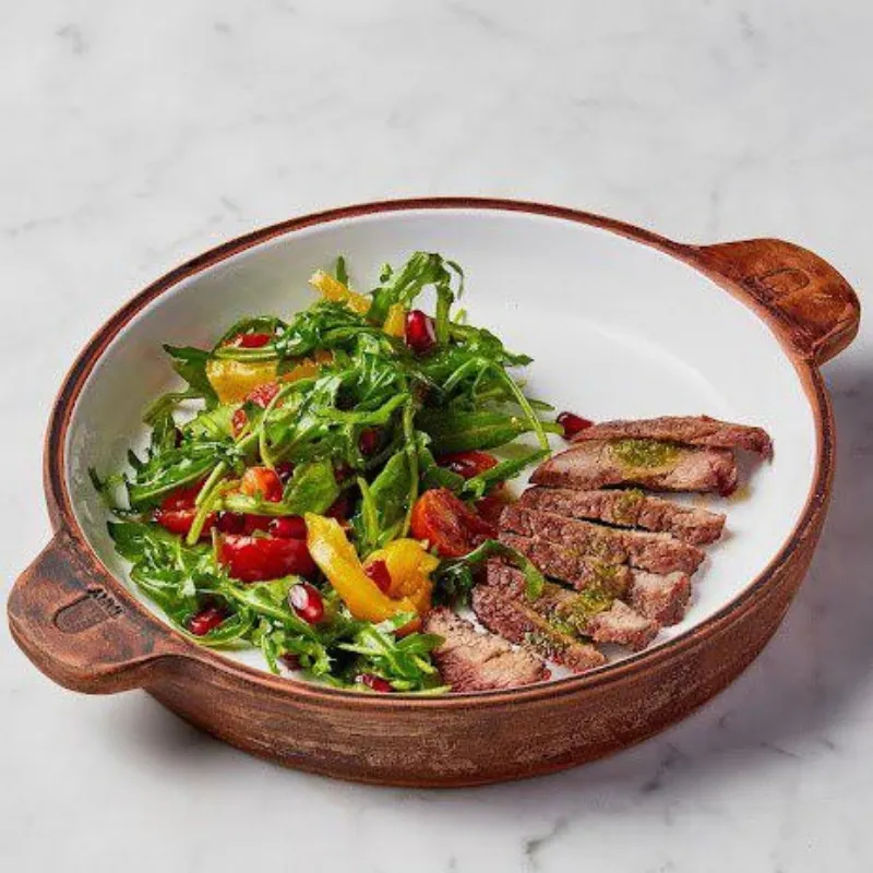 говяжья вырезка, сладкий перец, зерна граната, вяленный черри, рукола, авторский соус