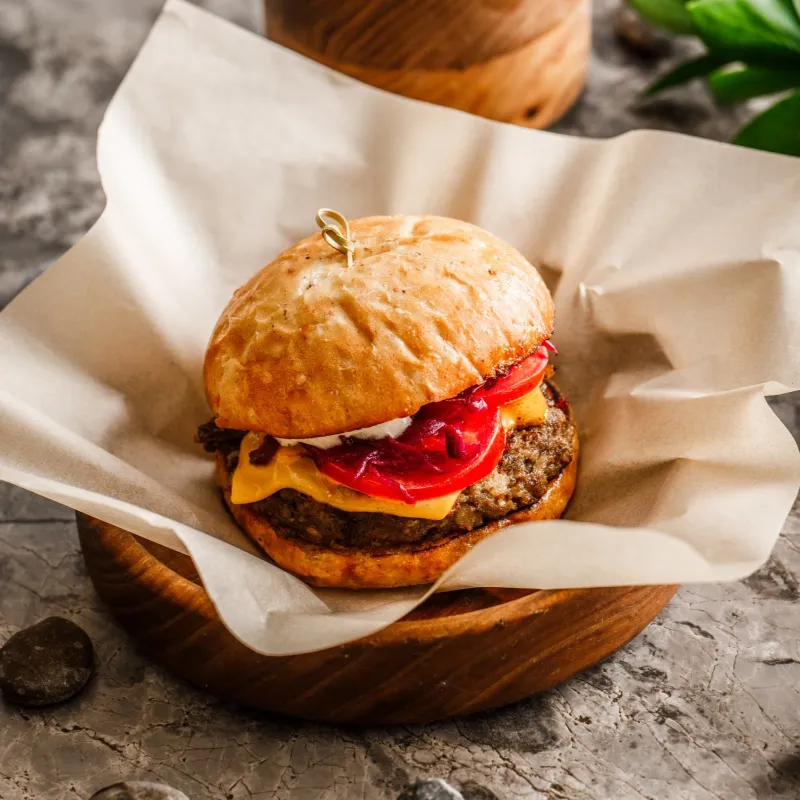 закрытая булочка, котлета из конины, авторский соус (котлета на выбор: говядина или конина)