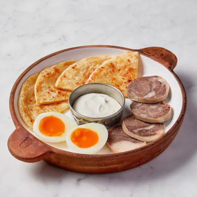 каттама (слоёная лепёшка) с сыром, казы, домашнее яйцо, каттык, классический чай на выбор