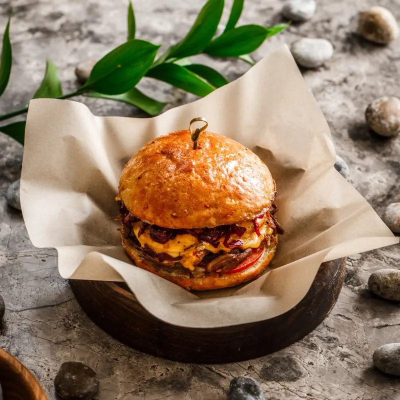 запеченный говяжьи ребрышки, свежая вишня, карамелизированный лук, сыр чеддер, соус