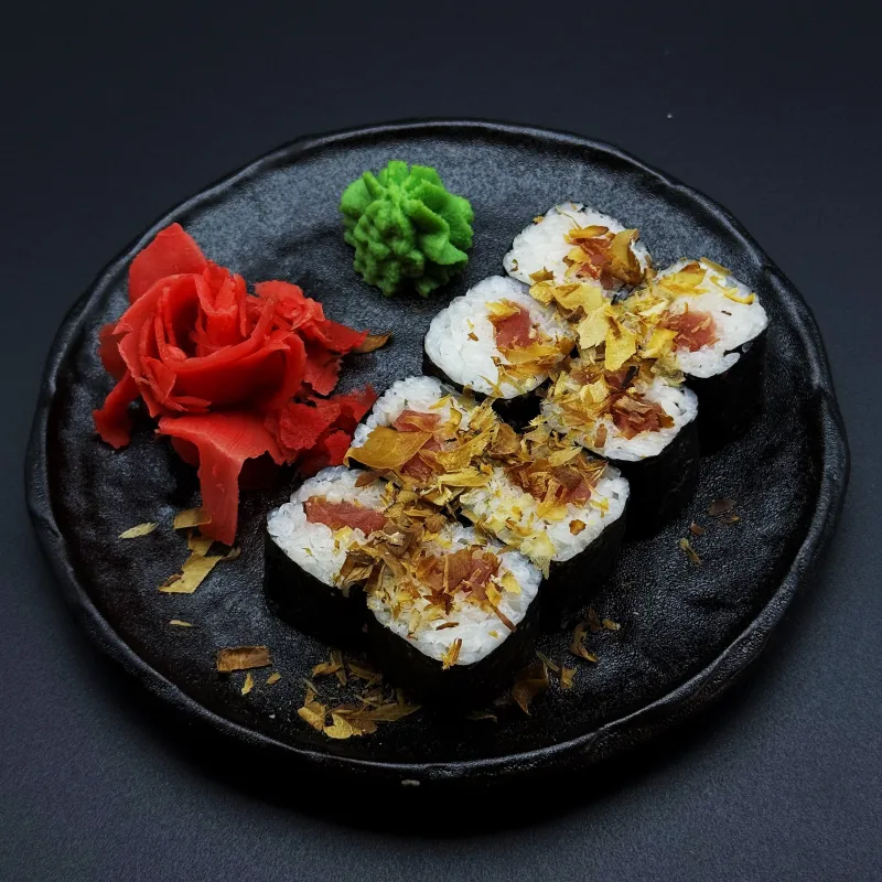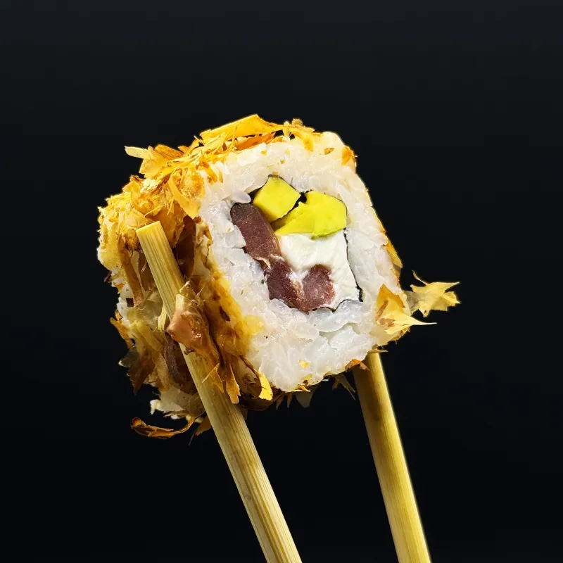 Ролл Бонито (порция 8 шт.) - утонченный ролл с нежным тунцом, сливочным сыром и свежим авокадо, обернутый в ароматную стружку тунца. Легкий, воздушный и насыщенный вкус с приятной текстурой. Идеальный выбор для любителей классических японских сочетаний. Подается с соевым соусом, васаби и маринованным имбирем.