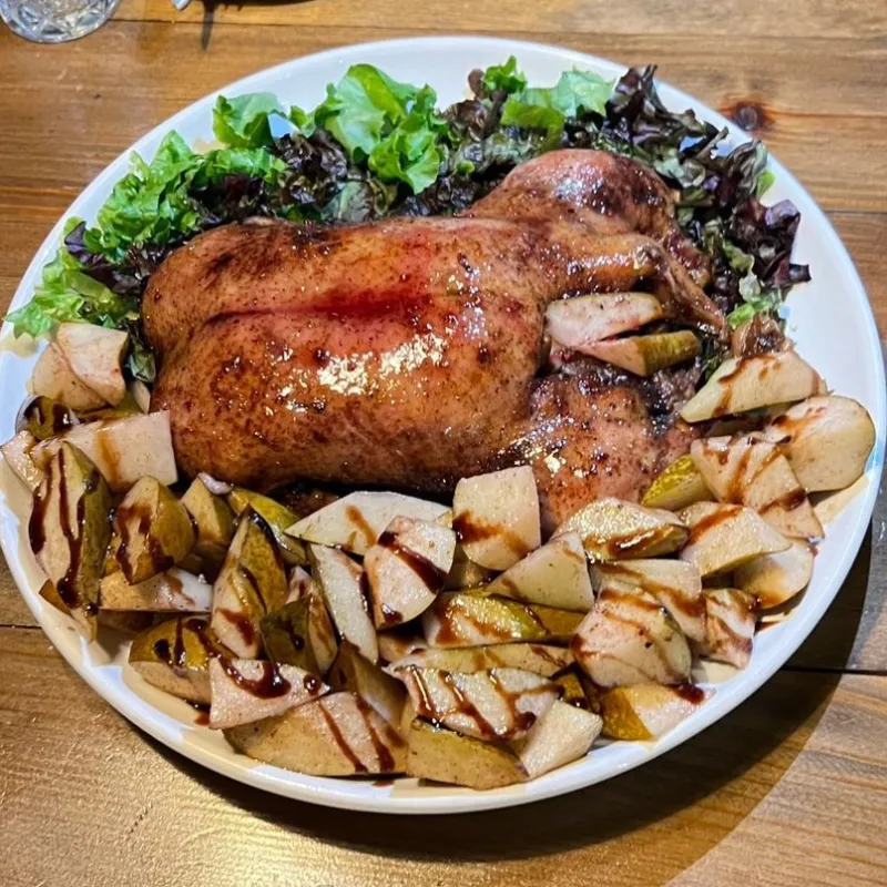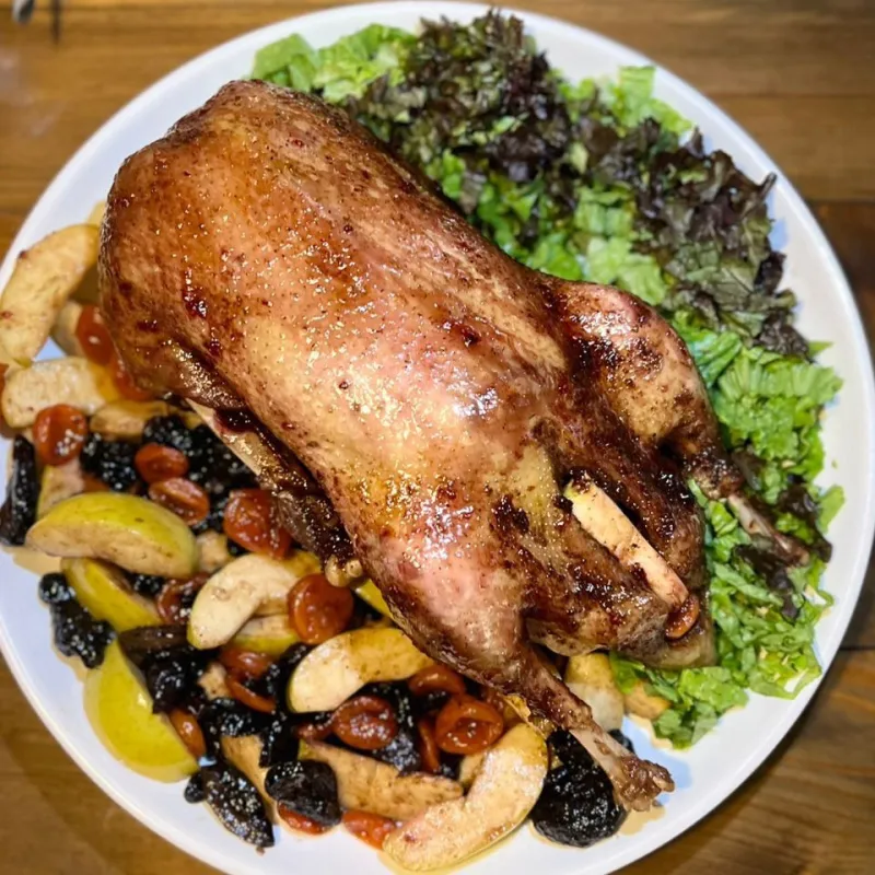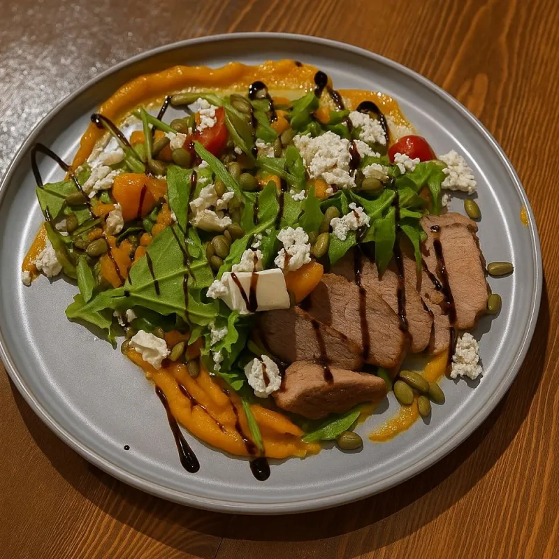 Утиное филе, запеченная тыква, тыквенный мусс, микс салата, сыр Салакис, тыквенные семечки, помидорки черри, соус сладкая горчица