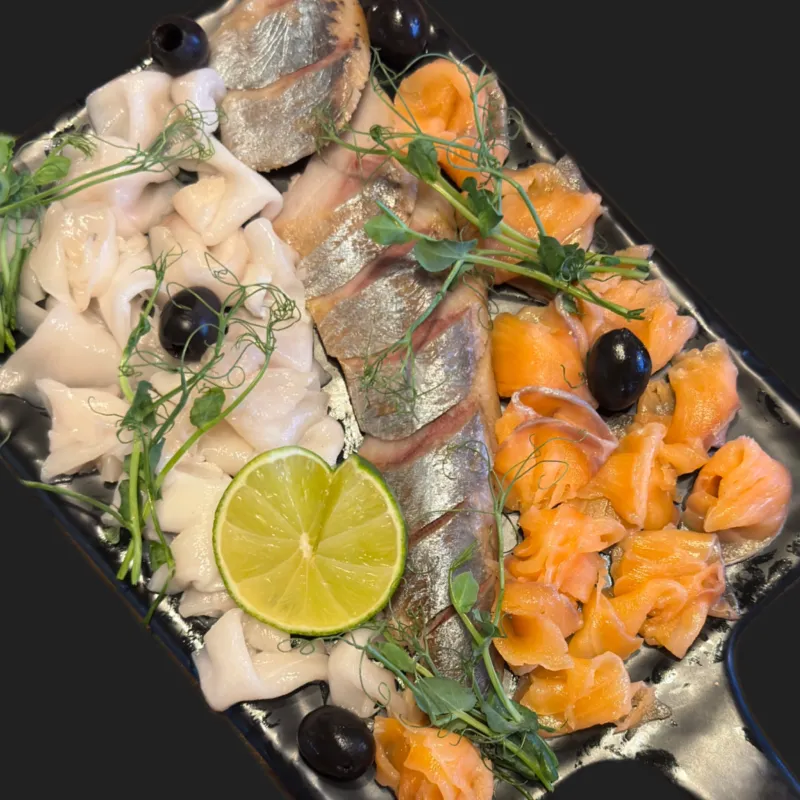 Слабосолёная сёмга, эсколар (масляная), сельдь, лимон, маслины