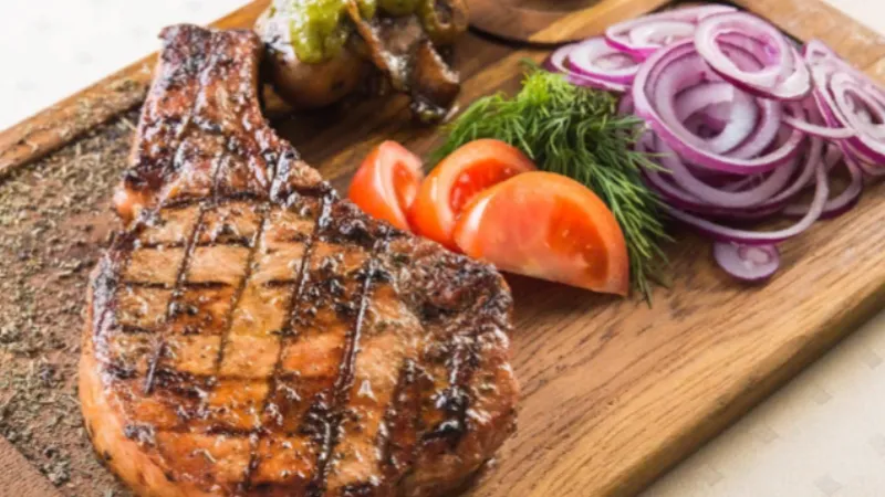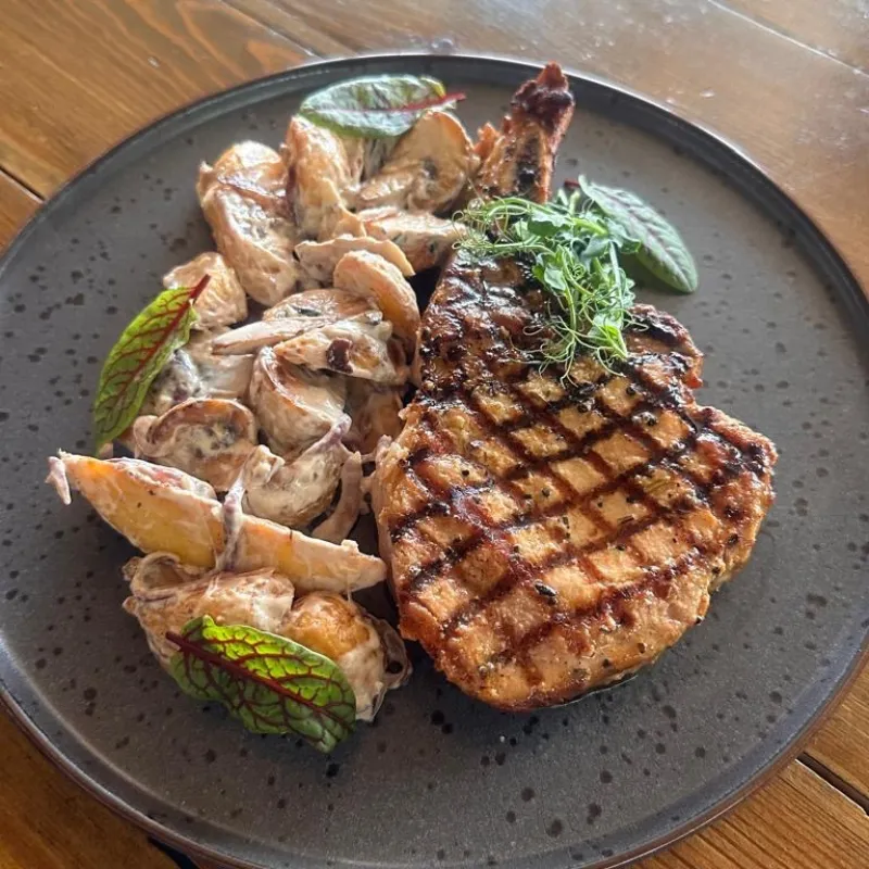 стейк свинины, шампиньоны, дольки картофельные, красный лук, сливки