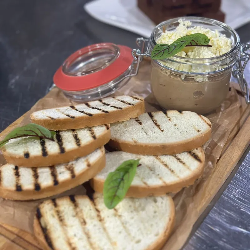 Куриная печень, морковь, лук репчатый, мускатный орех, сливки, крутон