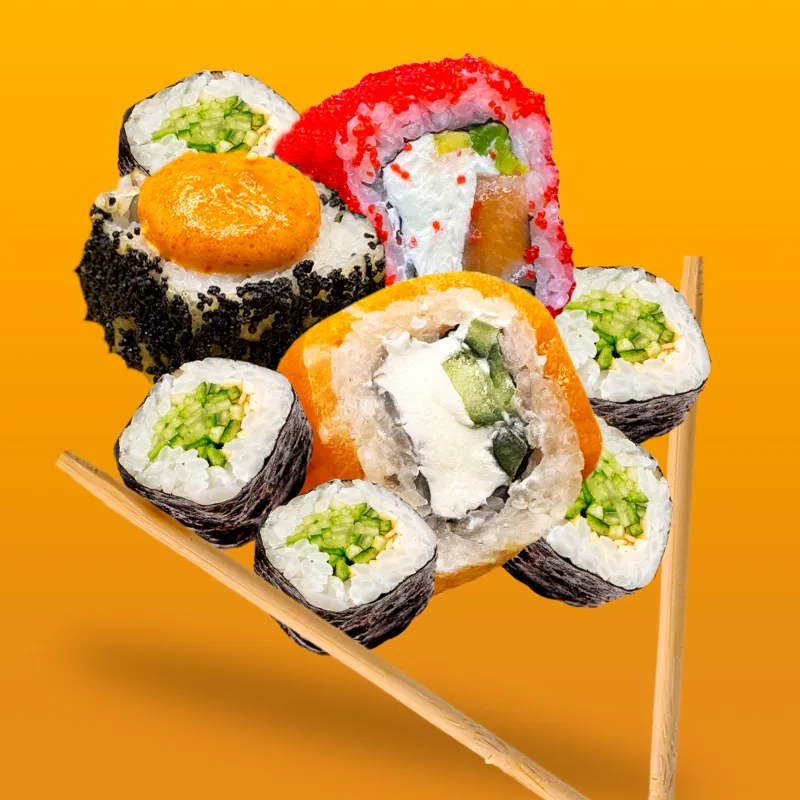 Ролл Дракон, Опаленный чиз с лососем, Филадельфия классик, Хосомаки сяки (лосось), Снежный краб, Жареный с креветкой, Ролл Бонита, Хосомаки Капа (огурец)