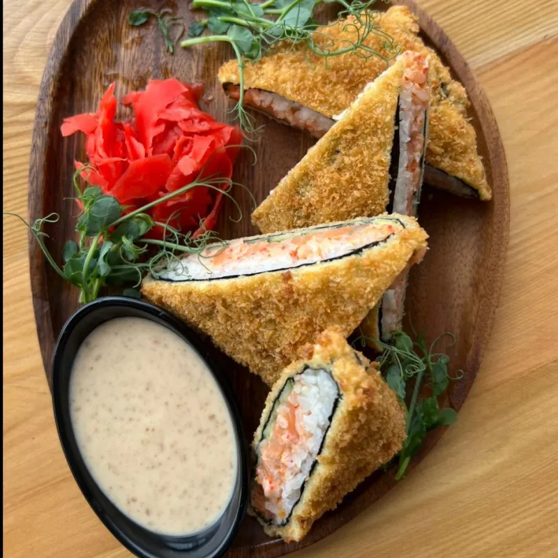 Жареный ролл с лососем (порция 8 шт.) - хрустящий ролл с сочным лососем, сливочным сыром и ароматным зеленым луком, завернутый в нори и рис. Обжарен до золотистой корочки и покрыт насыщенным унаги-соусом, который придает роллу глубокий вкус и легкую сладость. Подается с соевым соусом, васаби и маринованным имбирем.