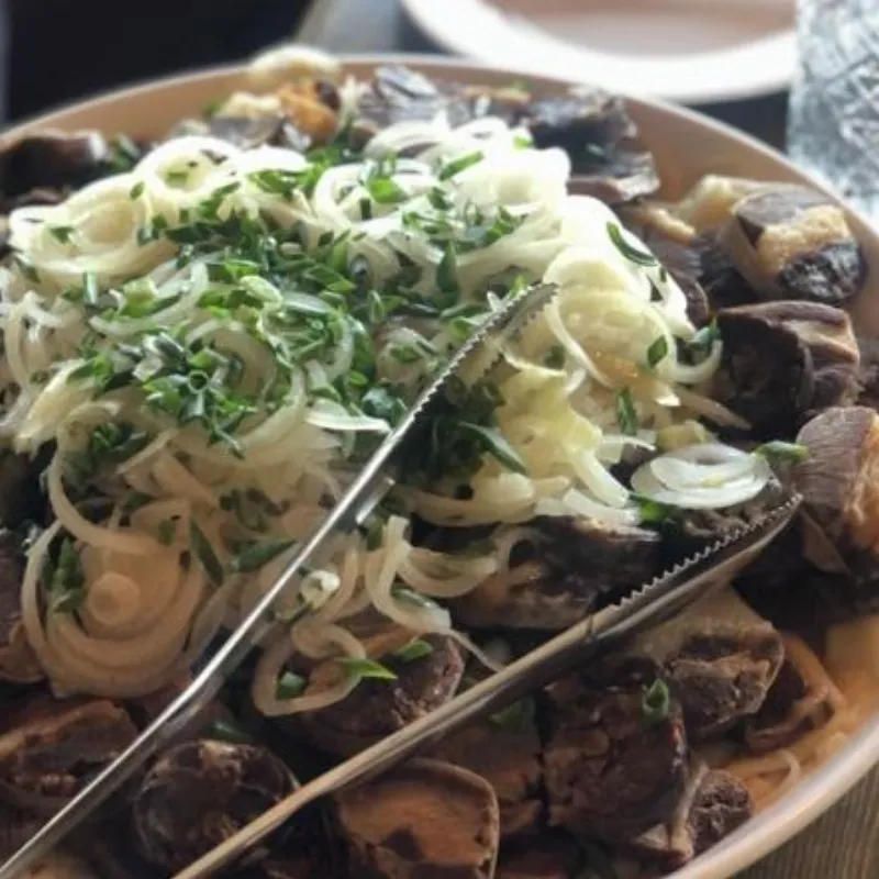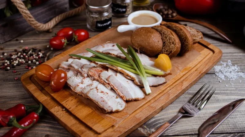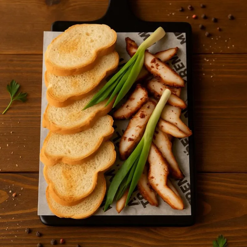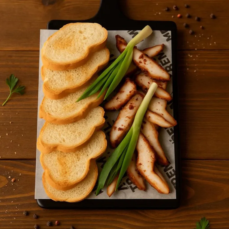 Подкопченный курдюк в пикантных специях, зеленый лук, тосты