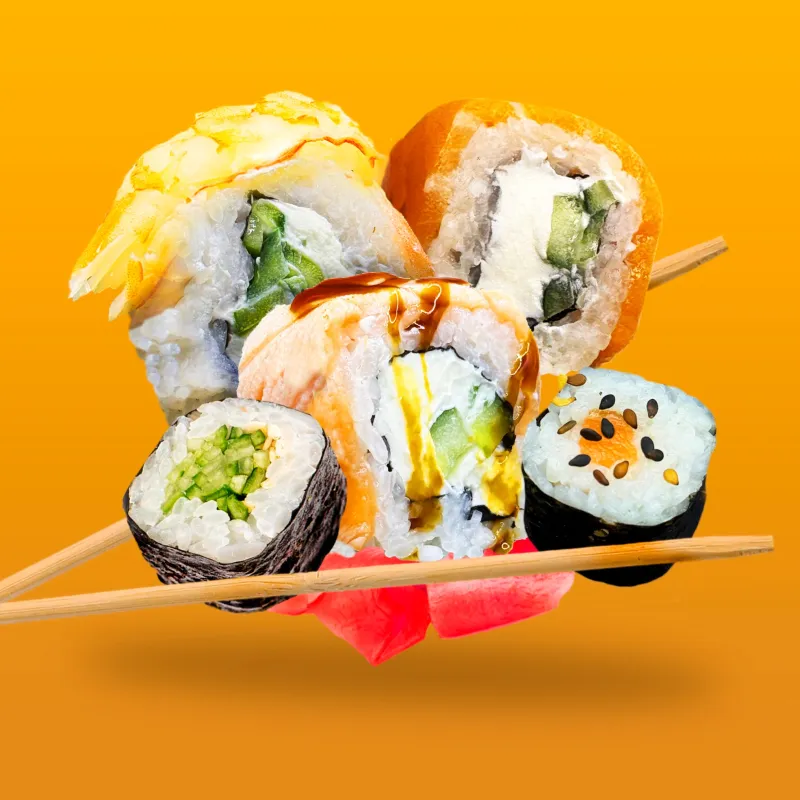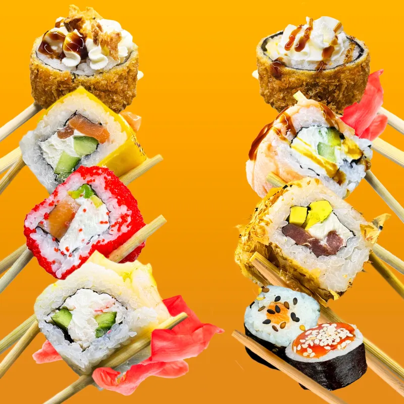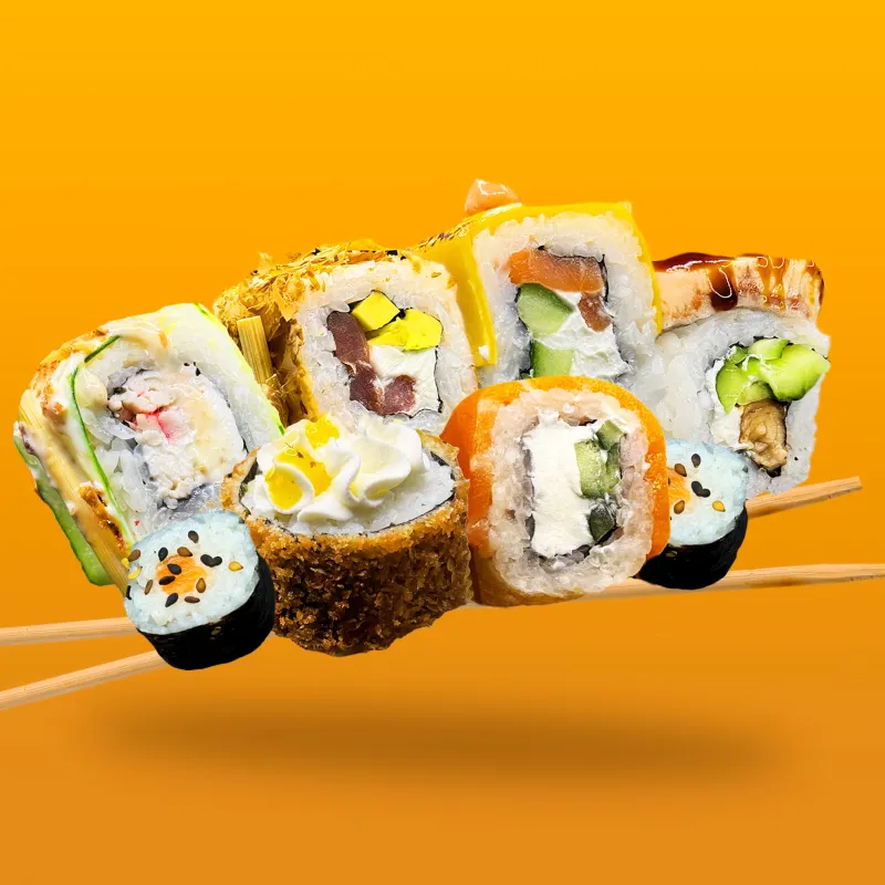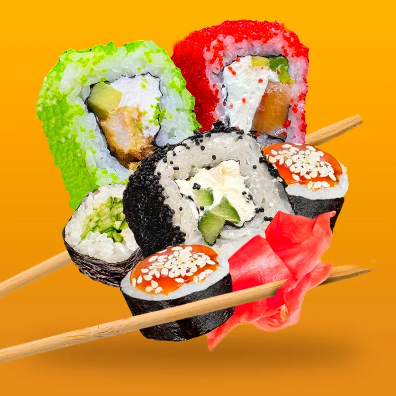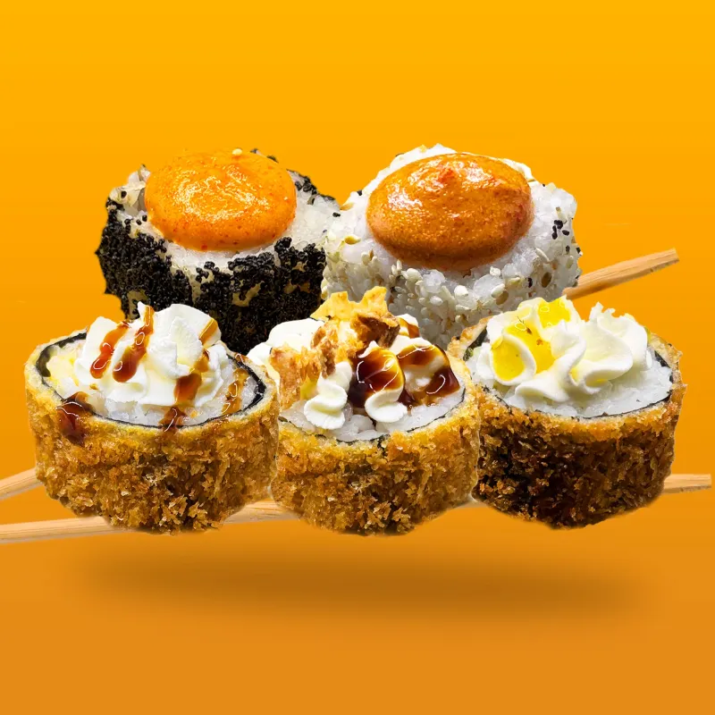 Ролл Бонита, Филадельфия гриль, Калифорния с лососем, Опаленный чиз с лососем, Тигр ролл,Чикен темпура, Темпура Сяки лосось, Хосомаки сяки (лосось), Хосомаки могура (тунец)
