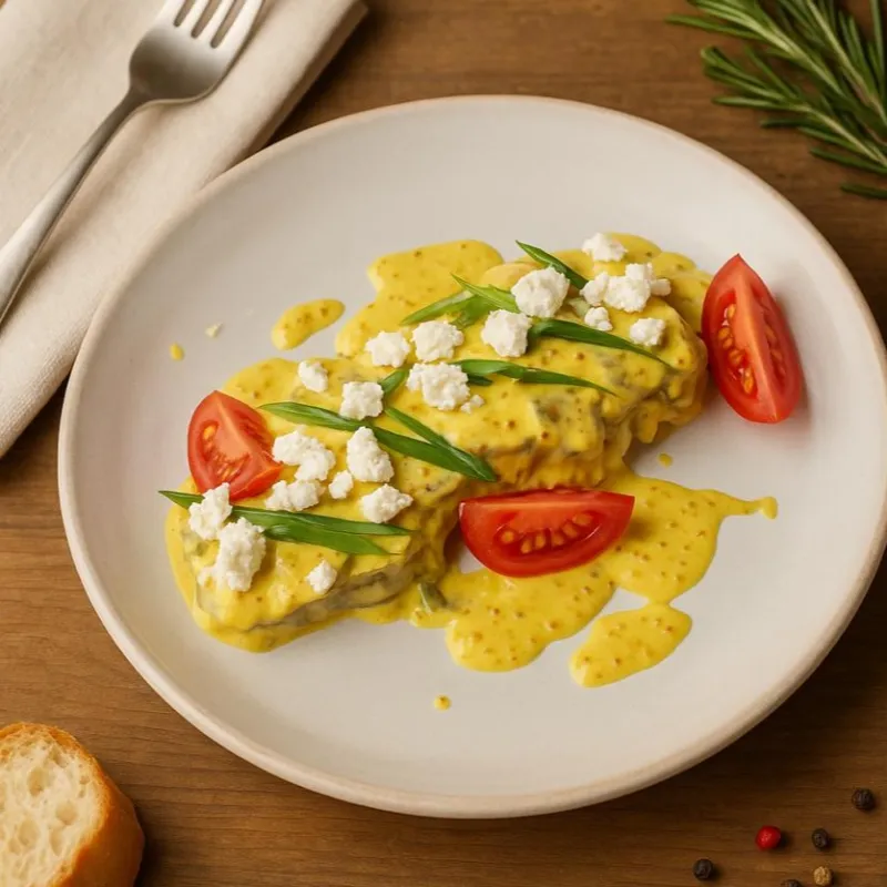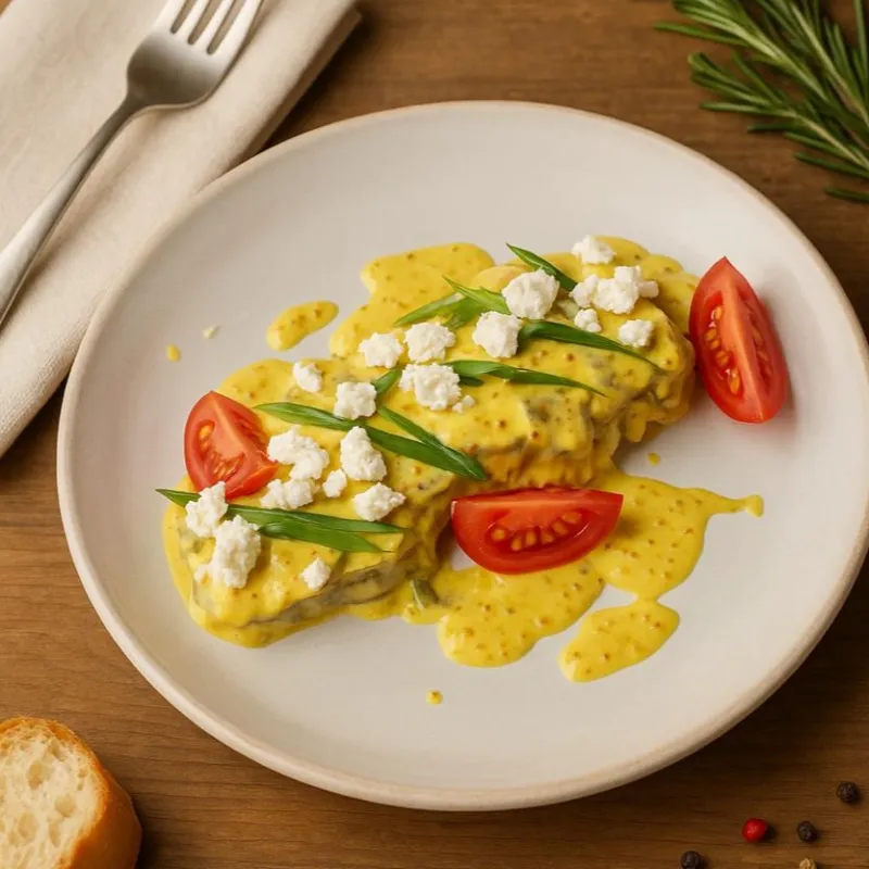 Говяжий язык, сыр салакис, помидоры черри, сливочно-горчичый соус