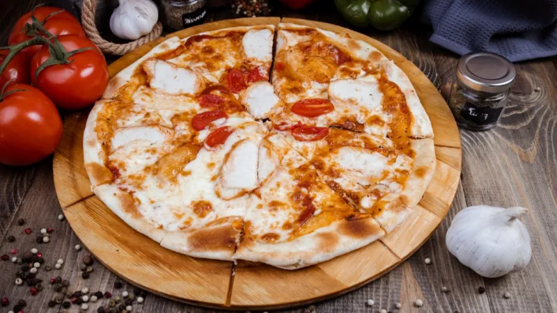 Куриное филе запечённое, помидоры черри, сыр Моцарелла, пицца соус, масло оливковое.